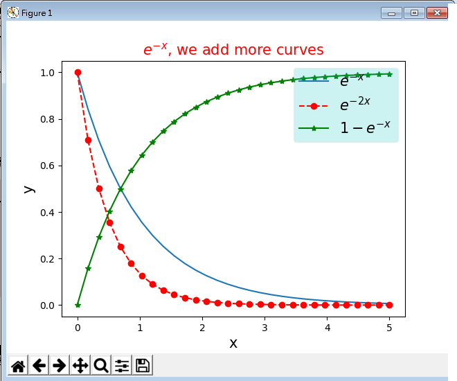 ax.set_title('$e^{-x}$, we add more curves', color='red', fontsize=15)