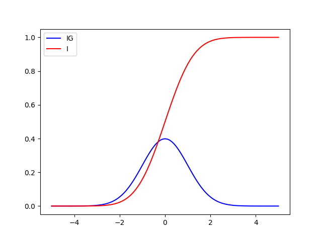 Find \(I(x)\) and make the plot of the integrand(IG), \(\frac{1}{\sqrt{2\pi}}e^{-x^2 /2}\) and \(I(x)\).