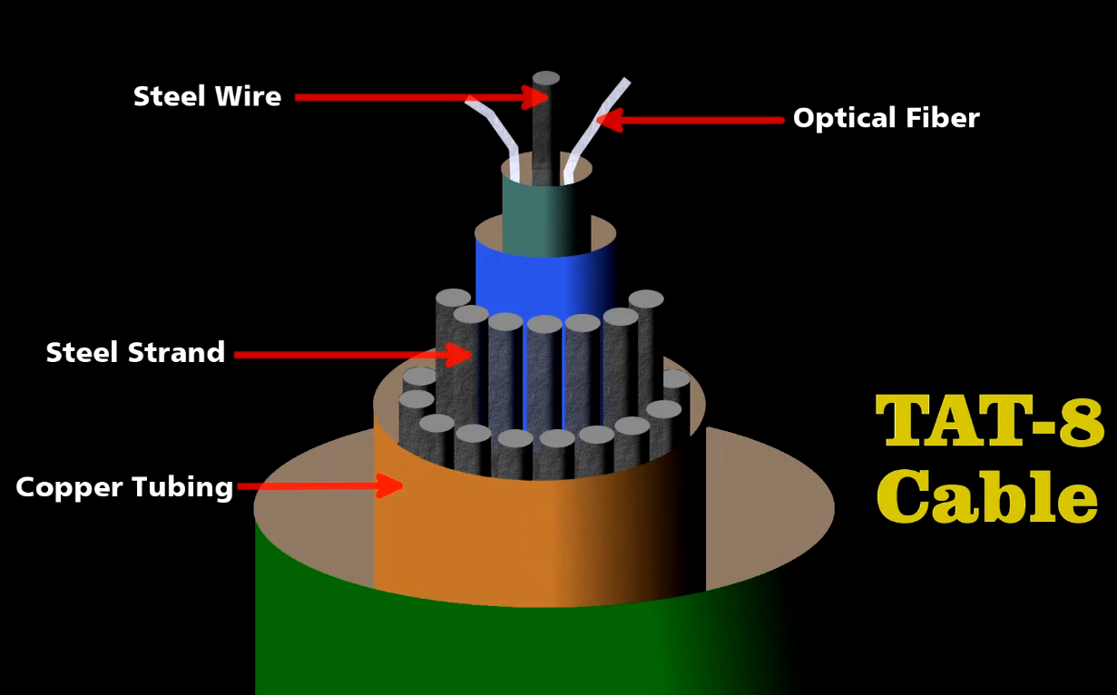 然後他們以拉扯纏繞,在車輪的方式來拉纖,速度可以高達每分鐘1600米,通常這些拉扯塔高達數層樓,高度使光纖在被纏繞前可以冷卻。其中一個應用光纖電纜的偉大工程成就是第一個跨海洋光纜,這個光纜叫做TAT-8,它從 Tuckerton, New Jersey,沿著大西洋海底經過3500英里分支到,英國的Widermouth和法國的Penmarch。工程師小心的設計電纜,才能讓電纜安全放置在海底。 核心位於電纜的中心,這個直徑小於1/10吋的核心,包含了6根光纖,這些些光纖纏繞著一中央鋼絲,光纖被嵌入在彈性體作為襯墊,用鋼絞線圍繞核心後,把它用銅圓柱體保護,最終的電纜直徑小於一英寸,但它卻可以處理大約40,000個同時通話。