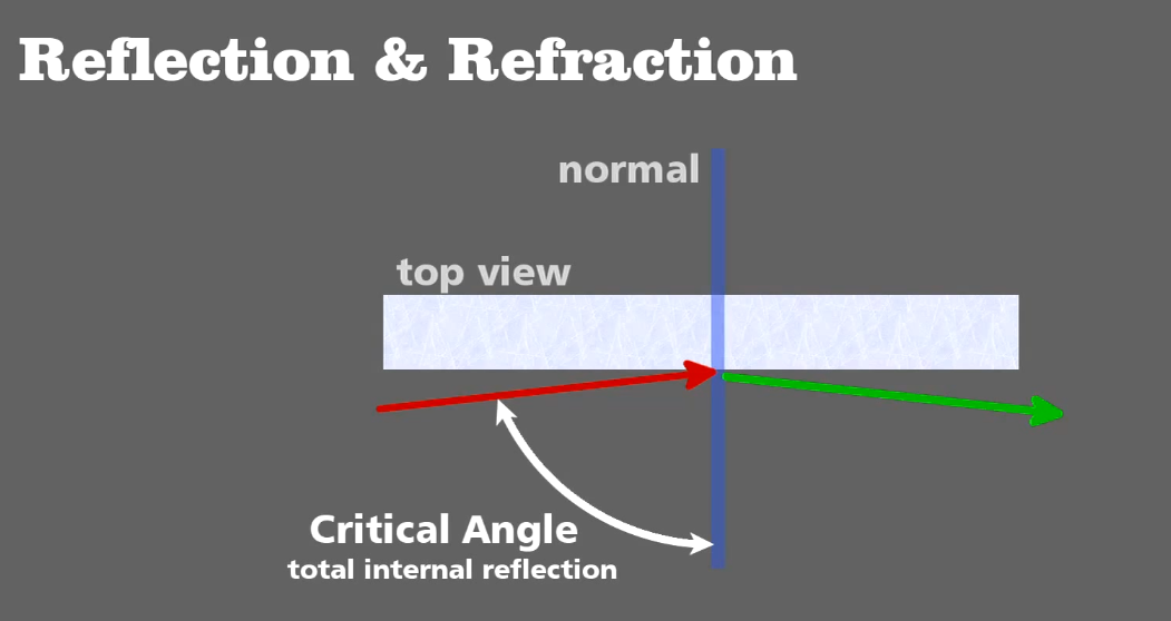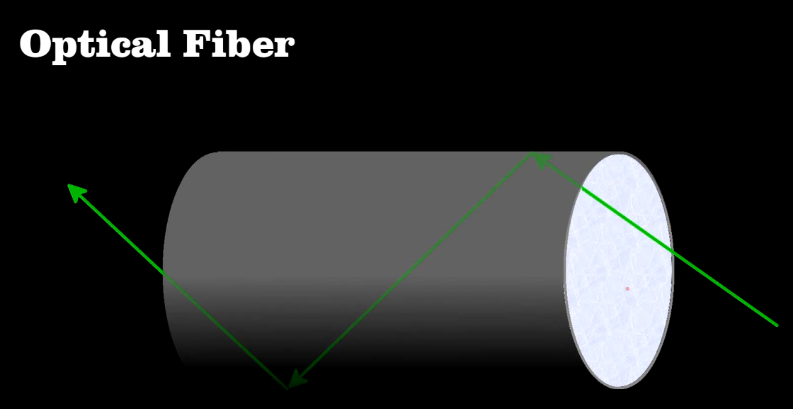 你可能會想知道一個雷射脈衝,是如何行走將近4000英里跨過海洋,雷射脈衝沒有一定的幫助是不可能,跨過海洋的因為光線會從光纖的兩側逃離。回頭看看我們的丙二醇流,可以看到光在行進時如何衰減,你可以在這裡看到一個在桶中的,窄光束進入丙烯流後拓寬一些,然後光束第一次反彈後更加比它反彈前更寬。這是因為與空氣的界面不平整,而構成光束的光線會在不同的角度反射到界面,當那光束進行二次反射後個別光線將發散更多。直到第三次反彈時許多光線,已經小於臨界角,並從丙二醇流的側邊流出。在這裡它發散的現象在幾英寸就發生了,但在像TAT-8的電纜中,信號可以傳50公里才需要被放大,