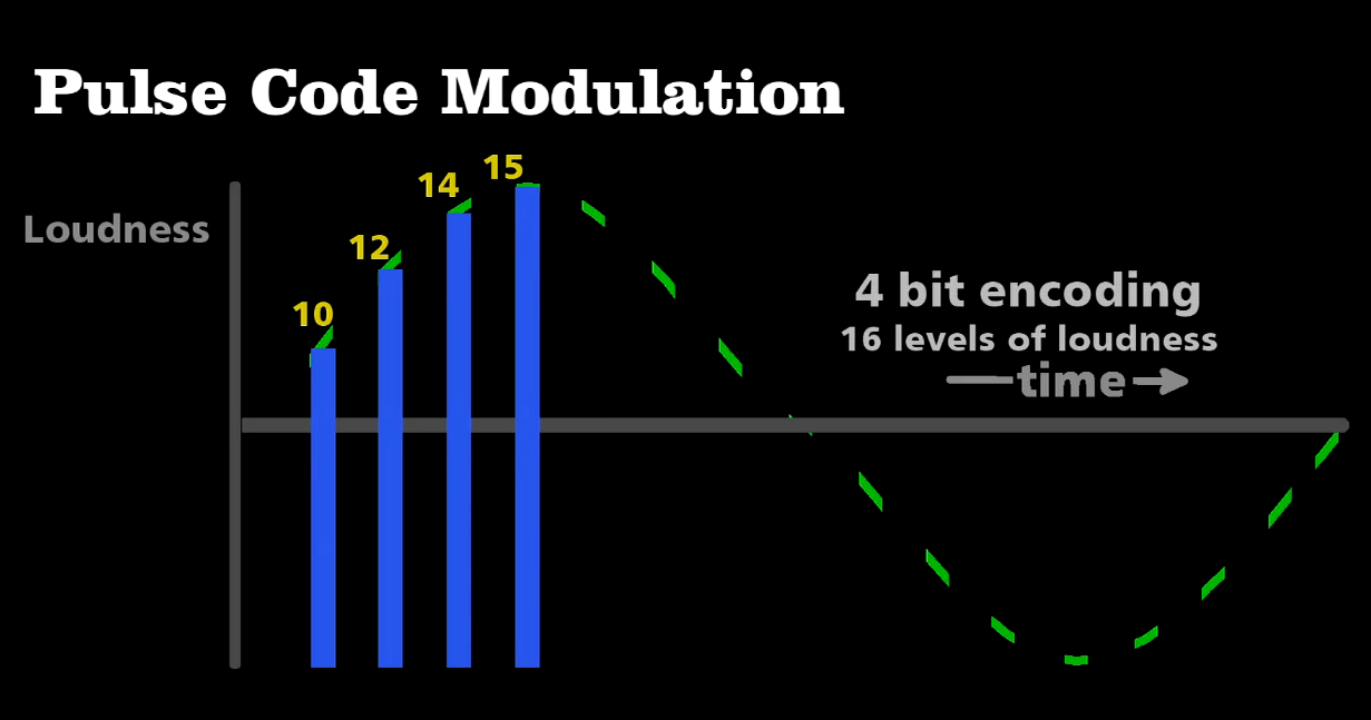 如何透過光纜傳送信息的本質是很簡單的,我可以預先安排一種密碼,並且讓一人在另一端接收,也許我們會使用摩斯密碼,當我擋住激光這樣在另一端的人,可以看到閃爍的光來傳遞訊息。利用電纜來傳輸像是語音通話的模擬信號,工程師需要使用脈衝編碼調變。我們將一個模擬信號切成片段,然後盡可能地近似波的響度或振幅。我們希望使之成為一個數字信號,也就意味著需要離散(discretize)響度。例如,我假如使用4個位,就代表我有16種可能的響度數值,所以前4段的信號可以被近似為,10,12,14和15。然後我們把每一段的振幅,轉換成一系列的0和1,所以第一段的10將變為1-0-1-0。我們可以為曲線的每一段,做這種數位化。綠色的波形信號或是藍色條紋信號都可以按照時間,安排成一系列的,1和0的信號。而這個序列就可以利用光纖傳送,閃光就代表1沒有閃光就代表0。在接收端解碼的確切方法是已知的,所以解開訊息是一件小事。