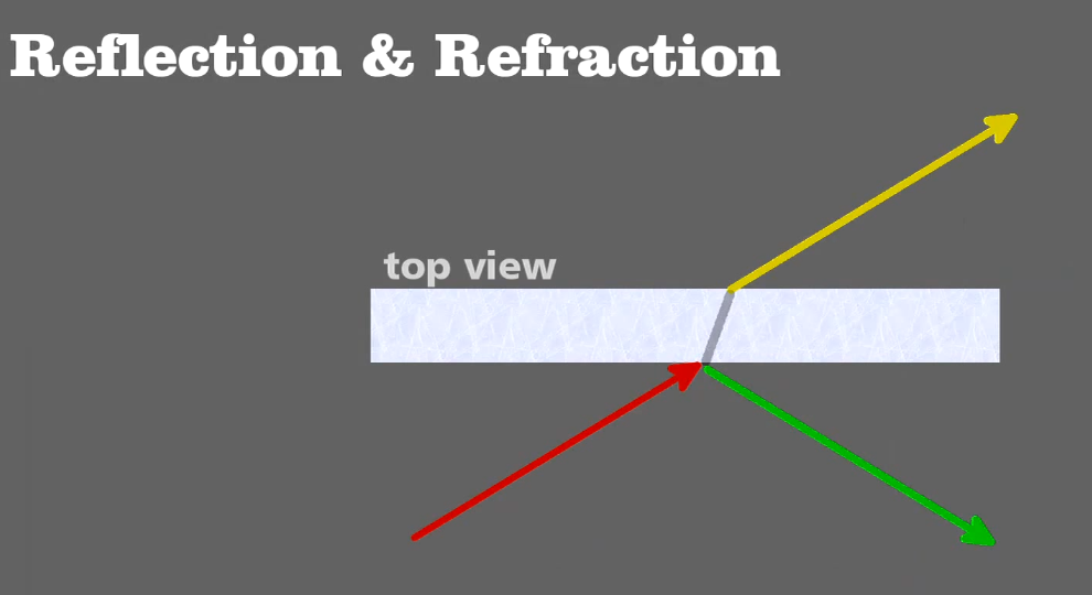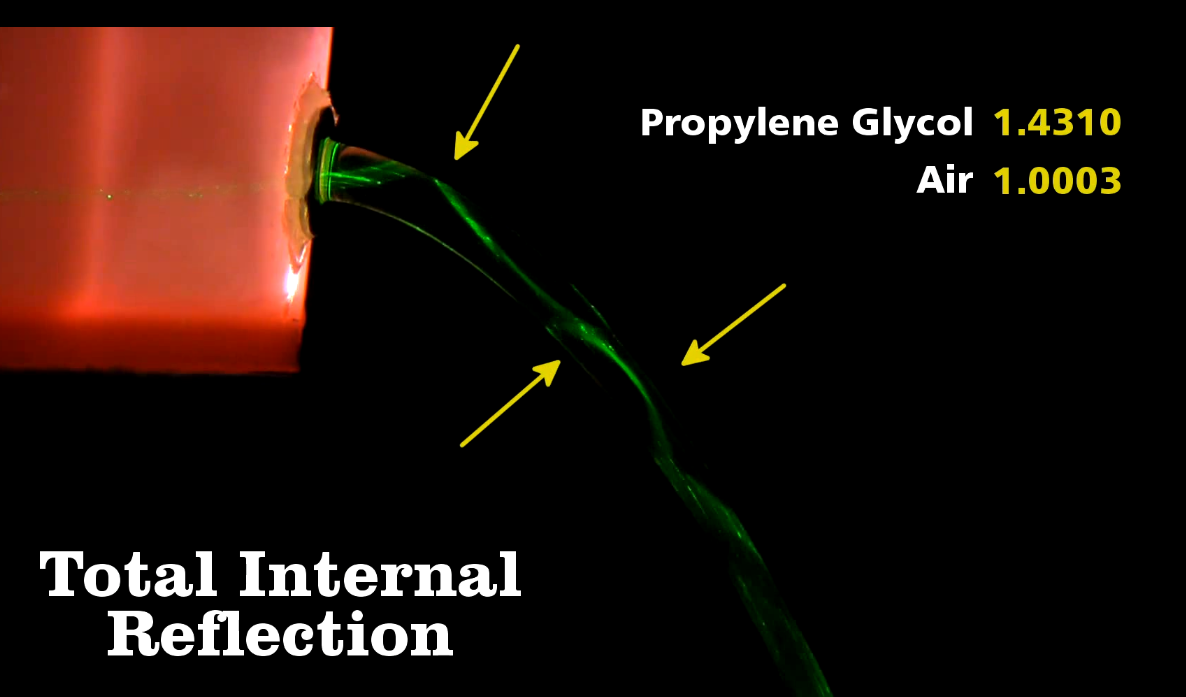 這種現象會發生是因為光導向介質,也就是丙二醇的折射率和外部空氣的折射率的差異造成。回想一下光照射一個表面時,可以被介質吸收,被介質反射,或進入並通過介質。進入介質我們稱為折射。從頂視圖看更可以瞭解,反射和折射可以在同一時間發生。但是如果光線以大於臨界角的角度擊中表面時,它會被完全反射而不發生折射。就這個丙二醇-空氣系統而言,只要光線的入射角大於44.35度,光線就會藉由全反射在液體流裡面傳播。