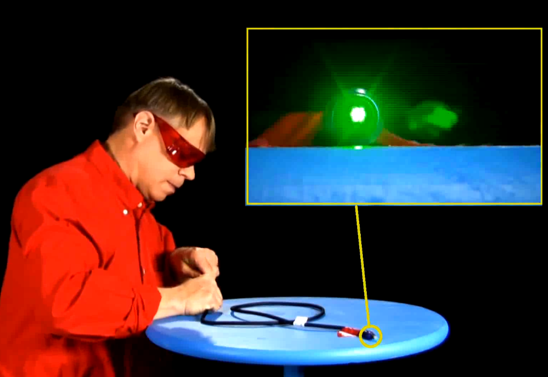 雷射如何產生具有這三個特點的光線那是工程中的傑作,讓我告訴你。任何在黑暗發光的玩具,可以說明建立雷射的基本原則。發光是因為其內部的鋅-銅複合塗層,可以從光源吸收能量然後再輻射出光。光提供能量給電子,使電子擁有較高的能量。一旦光源熄滅,這些電子會慢慢失去,所增加的能量,由激發態回到能量較低的基態,損失的能量以光的形式放出。與此密切相關的現象,就是雷射主要的原理。讓我來告訴你此工程的原理。用第一個以紅寶石,為基礎的雷射光作為例子,在這裡,我有一小塊紅寶石和一些紅色的玻璃珠,對玻璃珠照藍光沒發生什麼事。但對紅寶石照藍光它會發出紅光,不同於在黑暗中發光的球,光會立即出現,並在當我關掉藍燈時消失。