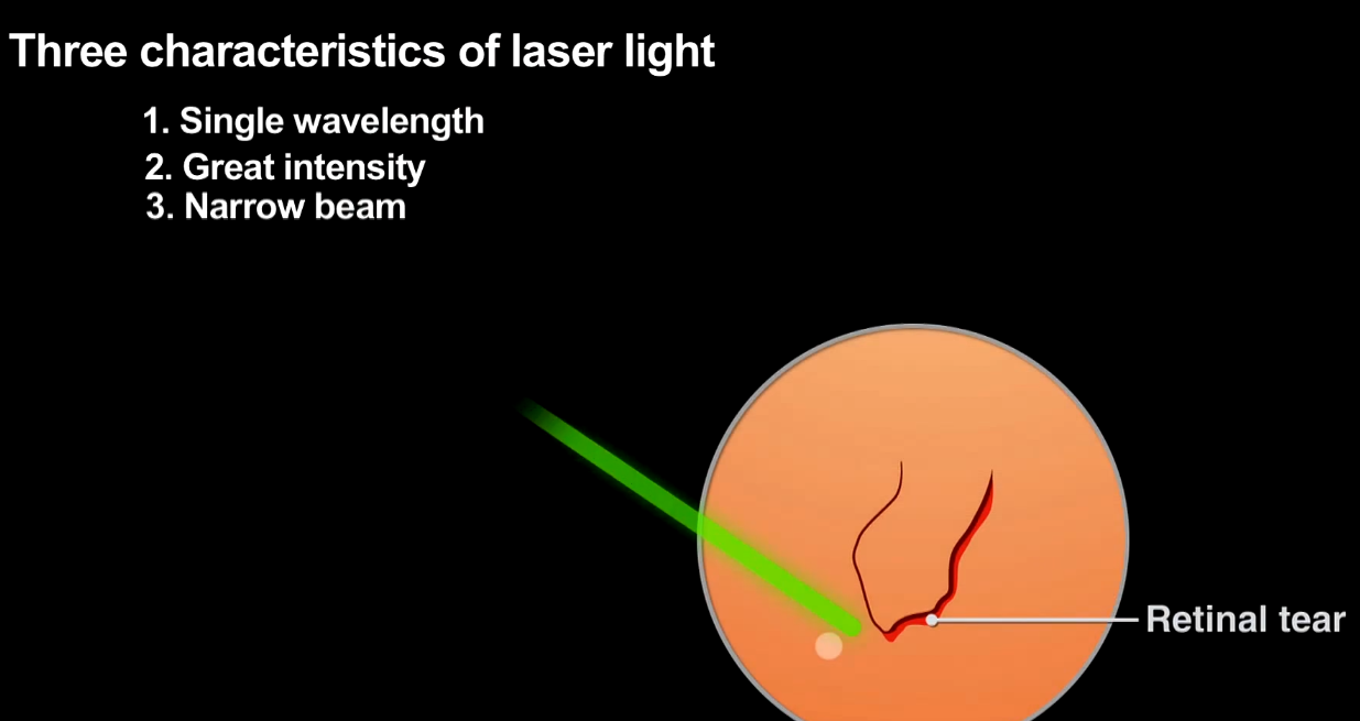 多年來雷射一直是,科幻小說的重要題材,在現實生活中,有許多技術也取決於雷射,例如測距設備,光通信,當然,還有條碼掃描器。雷射獨特的性質使得,所有這些事情成為可能。我們可以藉由眼科醫生,重建視網膜的手術,來了解雷射最重要的幾種應用。眼部損傷會導致視網膜剝離,原本支承它的組織,如果沒有快速治療,整個視網膜剝落會導致失明 。外科醫生使用幾乎,單一波長的綠色雷射光,因為這種顏色的雷射,穿過水晶體和玻璃體液時,不會被強烈地吸收因而不造成損傷,雷射接著打入視網膜,使組織強烈吸收雷射光。使用高強度的光進行焊接,將脫離的視網膜接回原位,光束的狹窄使雷射只影響視網膜區域,需要被修復的區域小至30微米。