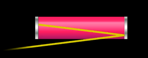 為了得到一個窄光束,與近單一波長的平行光線,需要對紅寶石棒再加工。梅曼將兩端鍍銀使其能反射長柱紅寶石的光。使桿的兩端彼此平行,從頂部到底部,這兩個反射鏡之間的距離不超過200 nm。在這個諧振腔(桿子)內,兩件事會發生。首先,任何不與軸線平行的光,會從長柱的任何一端離去,而平行於軸線的光會變得強烈,且光束變窄。鏡像的兩端造成駐波,這意味著,只有特定波長的光可以在腔內存在。透過選擇正確長度的桿,我們可以,得到幾乎單一波長的雷射光特性。在其中一個部分鍍銀的,鏡子上開一個小孔,可以使光線射出,創造出我們熟悉的雷射光束。在創建第一個紅寶石雷射之後,生產雷射已經變得容易和便宜。例如,這枝雷射筆使用半導體二極管產生光。然自1960年以來陸續發生許多創新和改進,但基本雷射原理是相同的。