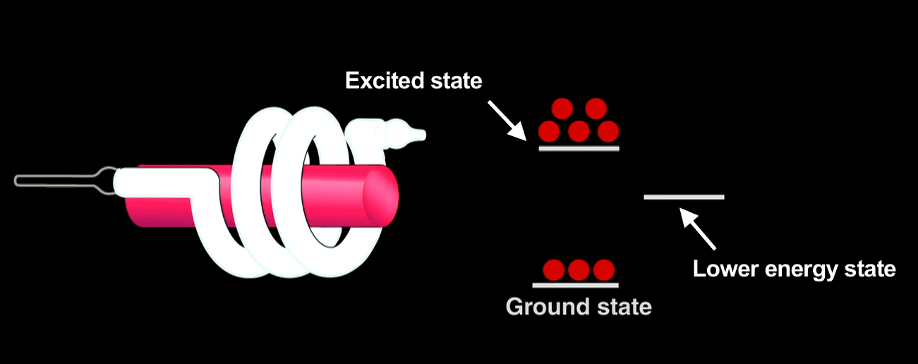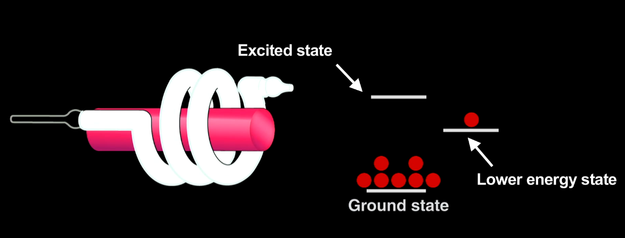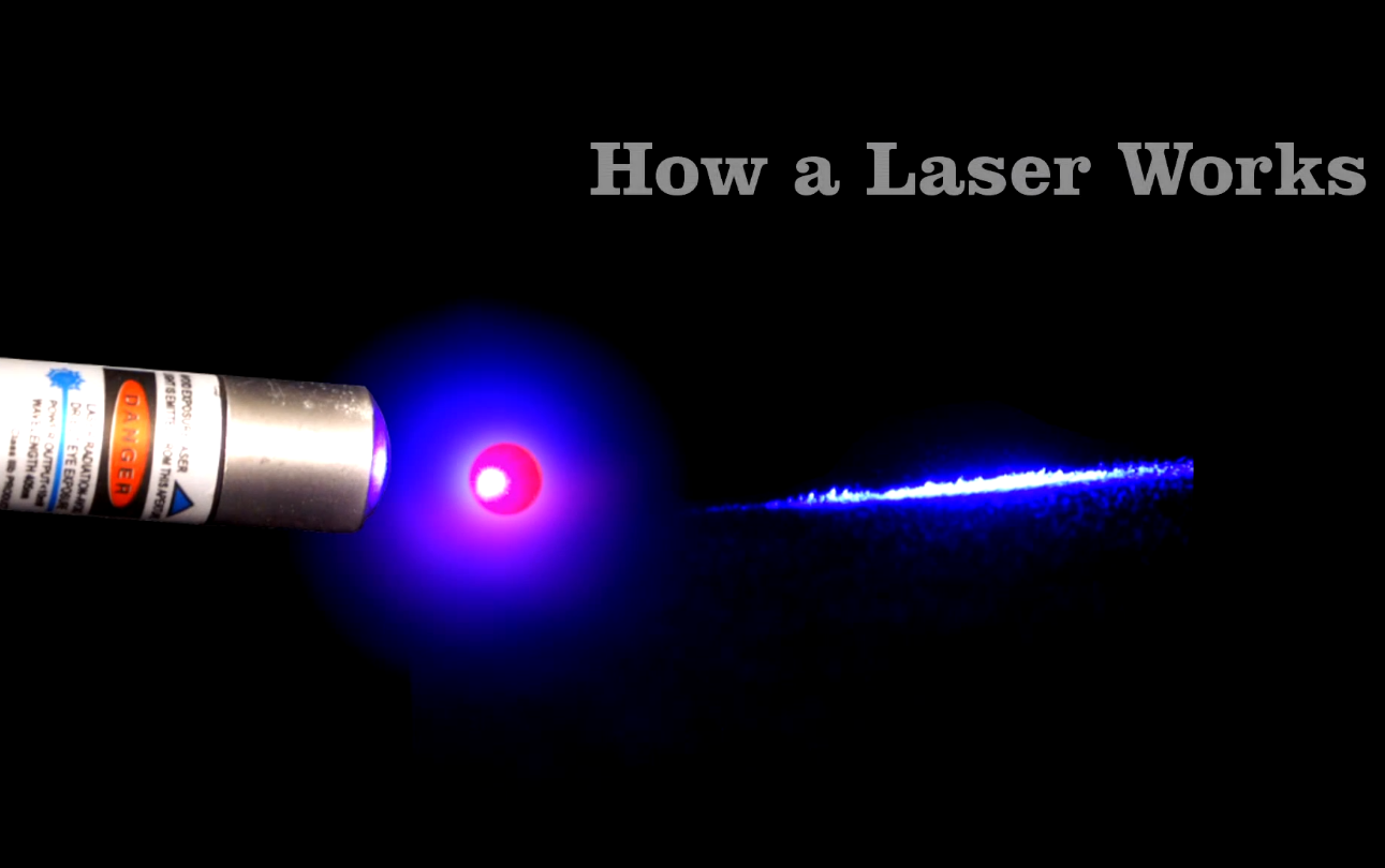 在1960年Maiman示範了第一個雷射,他將長柱形的紅寶石外圍繞著航空攝影常用的氙弧閃光燈,燈管中強烈的光啟動雷射。要了解它的原理,讓我們先使用一個較弱的燈。閃光燈會促進一些電子,從基態到激發態,他們會失去一點能量,下降到一個較低的能量狀態 ,但不會發光。然後再從那裡下降到基態,並瞬間放出光,所產生的光是非相干光。光譜的的顏色和強度,正如我的小雷射使紅寶石球發光。要創建一個雷射,需要一個非常強大的燈,在紅寶石雷射稱為pumping的重複閃爍,導致驚人的事情發生。他們提供的能量非常大,造成粒子數反轉的發生。在這情況下,位於高階的電子數比基態電子數多。電子從一個粒子數反轉的情況,返回到基態,會發出被稱為"受激輻射"的光。一個電子衰變且放出光子的過程,會引起其他激發的電子同時衰變,並釋放幾乎相同的光子,這會造成相干光。也就是每一個光波的波峰和波谷,可以重疊(同相位)。現在我們有了相干光特性,但尚未有雷射的另外兩個屬性。