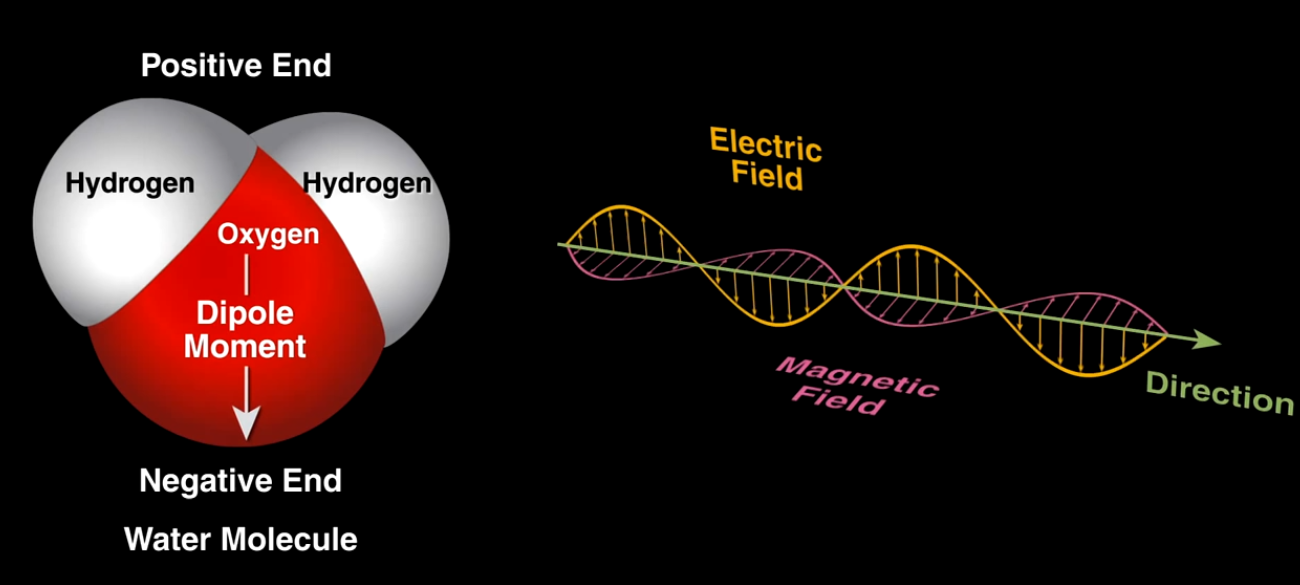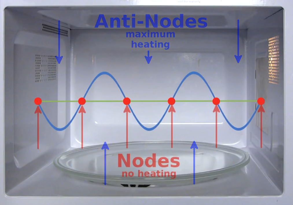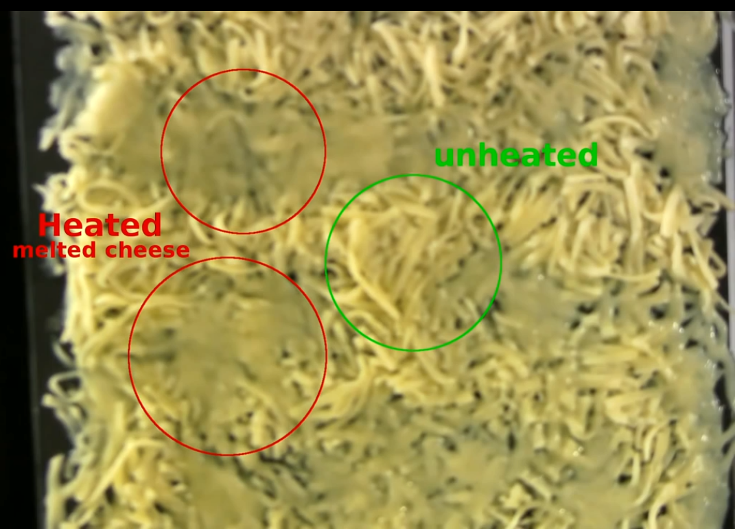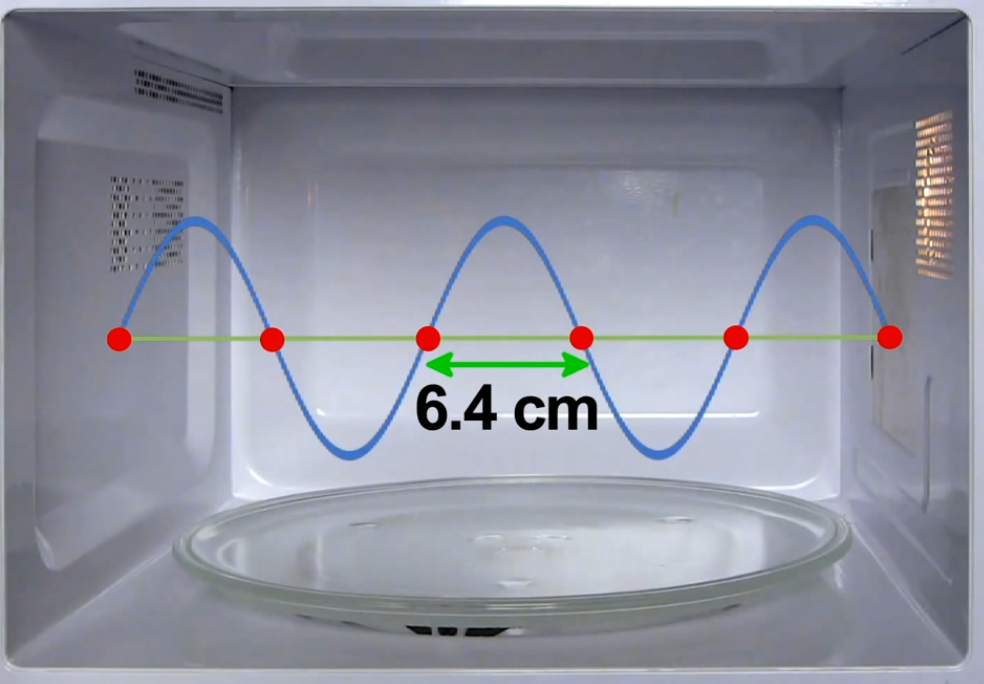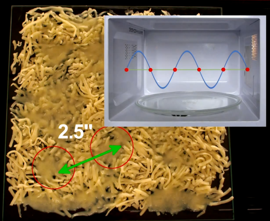 我們的食品充滿水,這代表一端帶正電一端帶負電的水分子,為了讓這些分子有更多的能量,我們將其暴露在從管發出的電磁波。根據定義電磁波有電場和磁場,可以快速改變分子的方向。對於這個微波爐電場與磁場的方向改變約為每秒24.5億次。水分子會盡量配合輻射的電場,不斷變化的電場使水分子轉動迅速,所造成的分子摩擦產生熱量,使鄰近水分子之間的氫鍵被破壞。現在你可以利用加熱乾酪,來了解磁控管發射電磁波的波長。你可以看到此區域的奶酪完全融化,而此區域的奶酪未被加熱。箱內的金屬牆壁只反射適合箱體長度的波長。這駐波造成箱內的熱點和冷點,波的三維圖案是難以描繪的,但其原理可以藉由,一維度下觀察波來了解。在波的波峰和波谷代表波的能量最大,而節點對應到冷點。如果我測量融化奶酪斑點之間的距離,我將得到2.5 inch(=6.3cm),這將是半個波長節點之間的距離,非常接近實際微波的波長。藉由此波長我可以估計微波的頻率,藉由光波長與頻率的關係進行計算。我得到的答案只有4~5%的誤差,對於這種初略粗的測試,算是蠻不錯的答案。