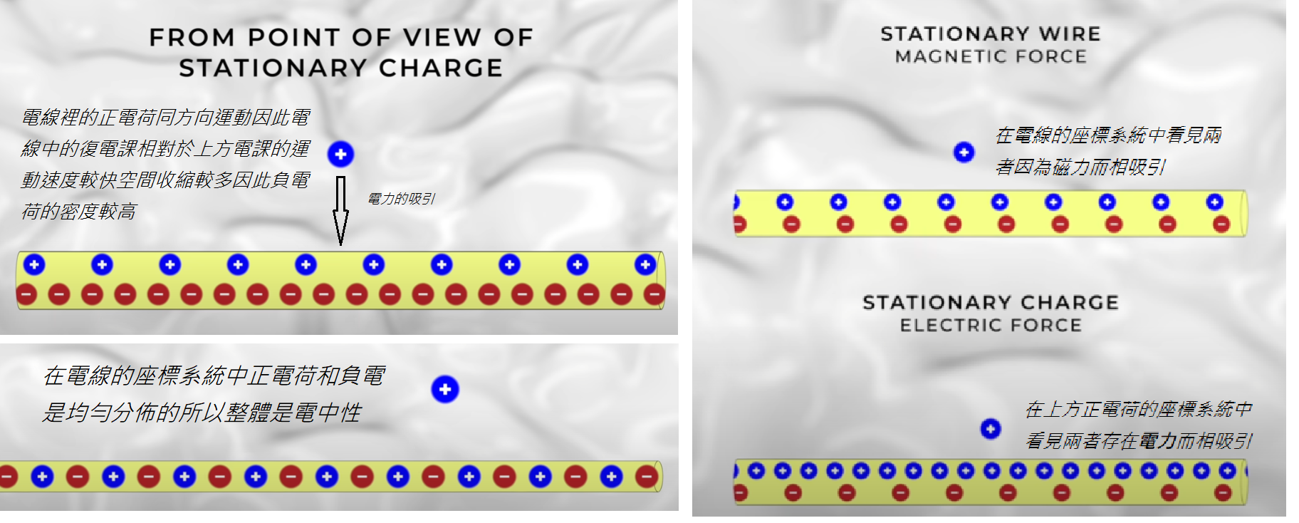 單憑馬克斯威爾方程式沒有辦法解釋為什麼磁鐵有磁性磁鐵看起來非常神秘。 它們的行為可以用Maxwell方程組來解釋。 然而,不小心的話你很容易讓自己相信麥克斯韋方程組證明磁鐵不可能發揮磁性的作用。 這就是陷阱——如果你不小心,你很容易讓自己相信磁鐵理論是錯的。然而,顯然,磁鐵確實能夠產生磁場,那麼這是怎麼回事?愛因斯坦如何拯救世界呢?電流的磁效應讓我們深入研究一下。如您所知,磁鐵通常是小塊金屬,可以吸附某些其他金屬。可將兒童藝術創作固定在冰箱上的”磁鐵”的工作原理,要解釋它可能有點複雜,但幸運的是,我們也可以用電流產生磁性,並且描述這種磁性的理論比較容易說明。我們將這種電流製成的磁鐵稱為電磁體,它們證明了愛因斯坦狹義相對論的奇異且完全非直觀的預測。電和磁是非常相關現象,你幾乎可以說它們是一體兩面,但是在外觀現象的展示上卻又非常不同。透過將兩個帶電物體相互靠近可以產生電力。根據電荷的不同,物體會被吸引或排斥。磁鐵則不同。 磁力只能在運動的電荷之間感受到。如果電荷是固定的,則不會發生任何磁力的作用。然而,如果一個電荷正在移動並產生磁場,第二個移動的電荷就會感受到它。但這是關鍵點是:對於磁性來說,兩種電荷都需要移動。當我們將兩根平行電流線彼此靠近時,可以最簡單地看到這種效果。如果我們讓電流流過底部,它就會在其周圍形成一個磁場。如果我們也以相同方向流過頂部電線的電流,就會感受到將電線拉在一起的力。相反,如果我們通以相反的方向在頂部導線中流動電流,則兩條導線會相互排斥。考慮單獨一個正電荷與電流的作用力現在,我不想用你在物理課上學到的方式(向量外積的右手定則)來描述磁性。雖然這些都是非常酷的東西,但是你可能在學使用右手定則的時候不小心就扭傷了你的手腕。這不是這支影片的重點。如果您從未學過物理,或者您已經忘記了所有內容,我會在下面的描述中添加一些其他視頻的鏈接,介紹電線中的磁性如何工作。請注意,我沒有製作這些影片。但你們中的一些人可能會歡迎回顧一下。另一方面,你不需要知道所有的數學之類的東西。您需要知道的是,必需移動電荷來產生磁力,如果運動方向相同,它們就會吸引。如果它們的方向相反,它們就會排斥。 現在,事實證明,如果我嘗試使用電線來解釋問題,它會變得超級複雜、非常快且高度數學化,所以讓我們使用一個簡化的範例來告訴您發生了什麼。最後,我將告訴大家在哪裡可以找到更詳細的解釋。好吧,我們不用兩條平行的電線,而是用一根承載電流的電線和一個沿著電流方向或逆電流方向移動的正電荷。如果電線沒有電流,但電荷在移動,則不存在磁力。 如果電線有電流,且電荷不移動,也不存在磁力。然而,如果有電流和移動電荷,就會有磁力,它的基本原理與電線相同——方向相同,則吸引,方向相反,則排斥。我剛才告訴你的一切都是對的,我在物理入門課上已經教過幾十次了。在不同的參考座標系觀察同一個現象然而,現在讓我們像愛因斯坦一樣思考。我的意思是,當然,我們可以說電荷在移動,但從電荷的角度來看,它沒有移動。 它是靜止的,而世界卻在移動。由於我們需要移動的電荷來感受磁力,這意味著電荷應該感受不到磁力——至少在它自己的參考系中。所以這完全沒有意義。在我們自己的坐標中,我們認為電荷應該感受到力,但電荷在其自身的坐標中認為不應該感受到力。 正如他們所說,這是一個悖論。相對論做了一些奇怪的事情,但是如果電荷移向或遠離電線,兩個觀察者應該達成一致。這就是你如何說服自己磁鐵理論是錯的。然而聰明人相信磁鐵理論。那麼它是如何保存的呢?好吧,要做到這一點,我們需要考慮線路中到底發生了什麼。電線中存在正電荷和負電荷。電線本身是電中性的,但在標準電學理論中,我們說正電荷是移動的,負電荷是靜止的。是的,這確實有一些問題,我會回來討論的。但我們還是使用傳統觀念吧。因此,外部觀察者會看到電線中的靜止負電荷和移動的正電荷,以及電線上方的移動電荷。為了便於說明,我們會說它們正在向右移動。電線中移動的正電荷建立了磁場,上方向右運動的正電荷受到這個磁場的作用,產生向下的磁力,因此向下運動。我們問頂部的正電荷在其靜止的參考系中看到什麼?負電荷正在向左移動,正電荷可能仍在向右移動,但與靜止的人相比,速度比電線慢。這就是相對論發揮作用並產生奇蹟的地方。請記住,狹義相對論表明,不僅移動的觀察者的時鐘走得更慢,而且移動的物體也會變短。這稱為長度收縮,我製作了一個有關該內容的視頻,您可以觀看,其連結在影片描述中。因此,導線外部的電荷,可以看到導線中的負電荷移動較快,而正電荷移動較慢。由於導線中的負電荷會相對於外部電荷移動得更快,因此負電荷之間的間距比正電荷之間的間距收縮得更多。我暫停動畫,以便您可以看到效果。這意味著負電荷比正電荷更集中,這意味著電線現在帶有淨負電荷(帶負電)。因為我們知道異性相吸,所以會發生的情況是,雖然現在靜止的頂部正電荷不會感受到向下的磁力,但它會感受到向下的電力。曾經的磁力(相對於實驗室的座標系統),現在變成了電力。但無論哪種方式,力都是向下的。 如果我們觀察電線外部的電荷以與電
